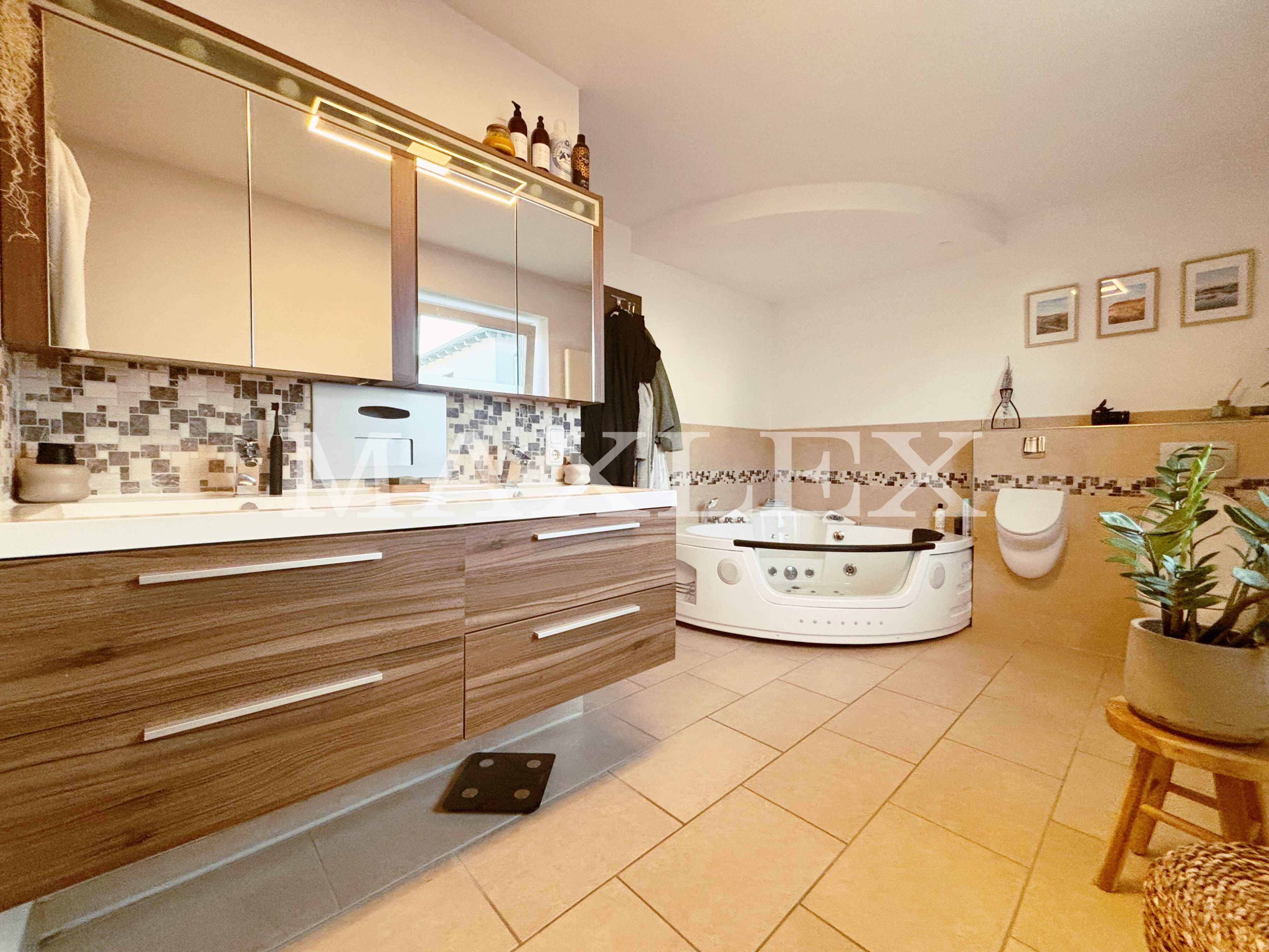 Erdgeschosswohnung (ca. 86 m²): 2,5 Zimmer, großzügige Terrasse (24 m²) mit Markise und gemauertem Grillplatz, modernes Bad mit begehbarer Dusche und Whirlpool-Wanne, hochwertige Einbauküche mit Side-by-Side Kühlschrank