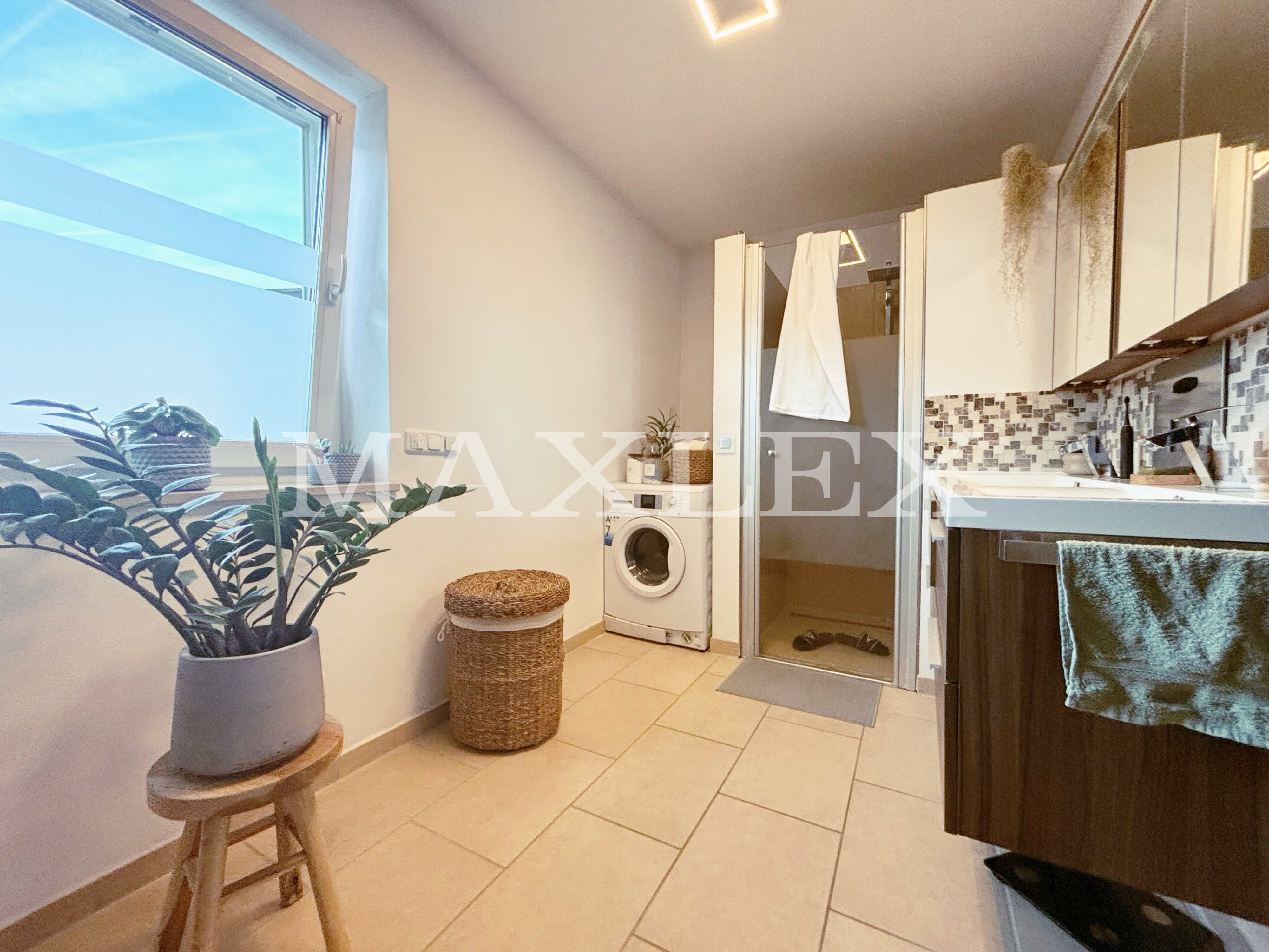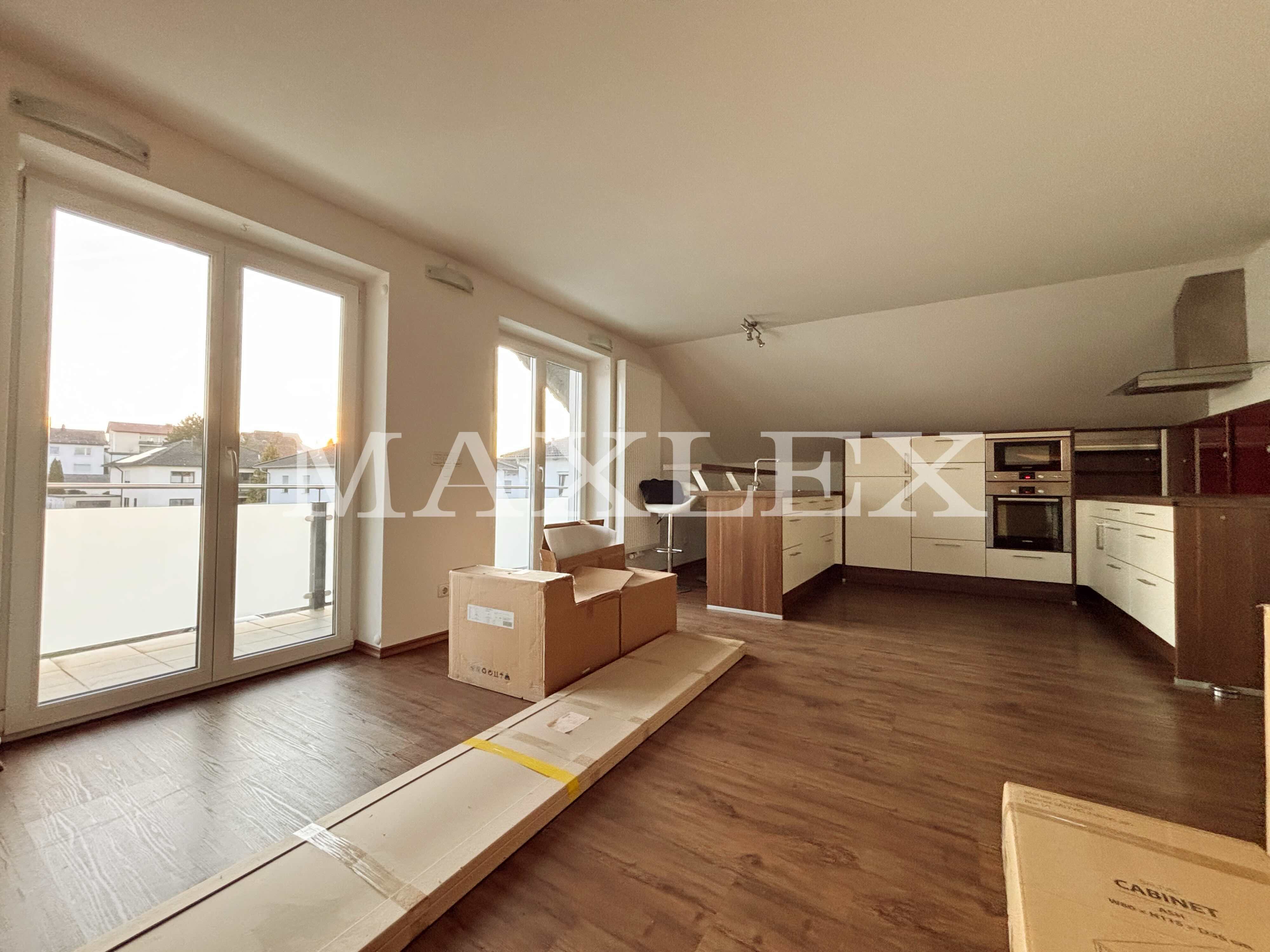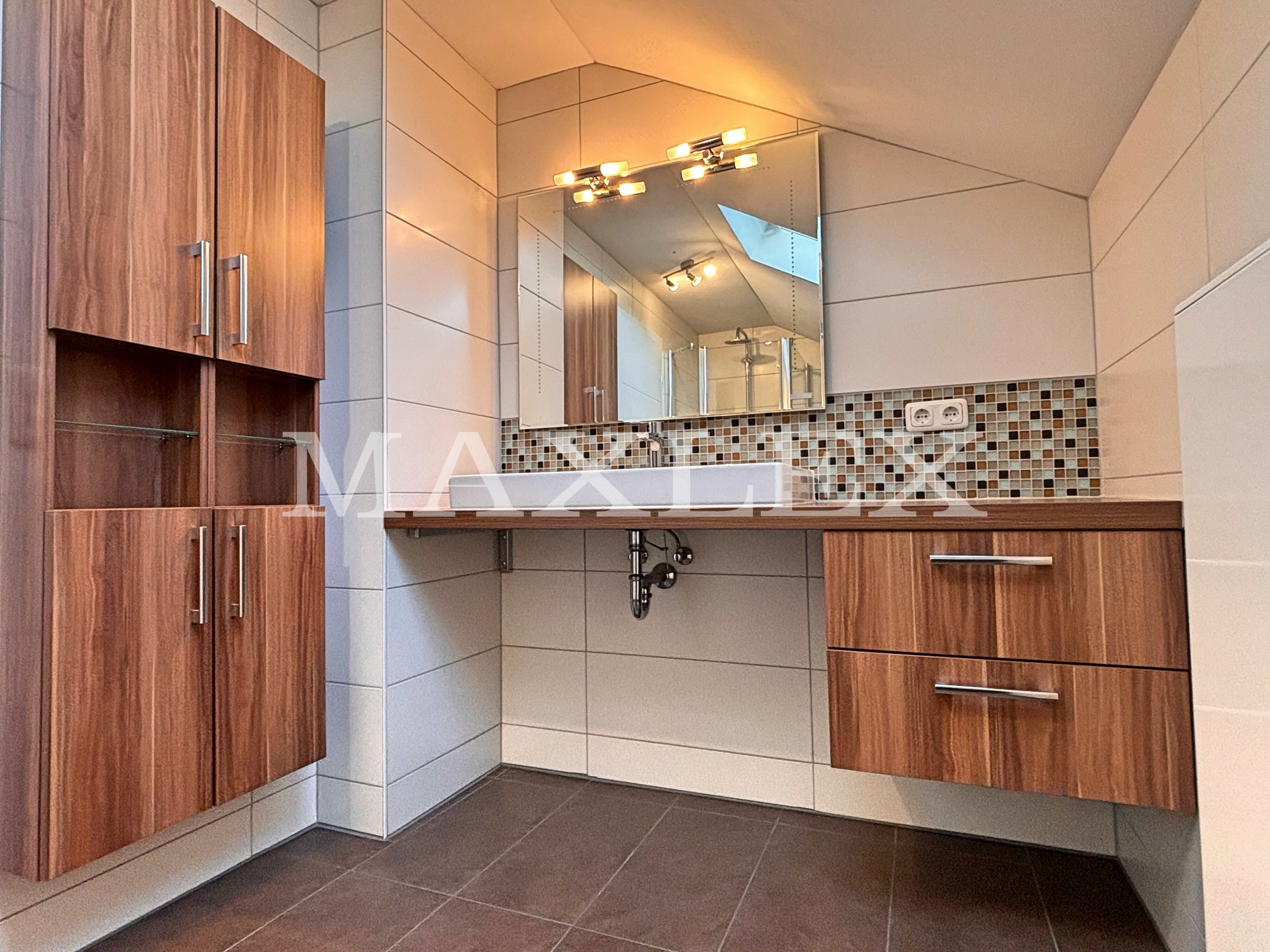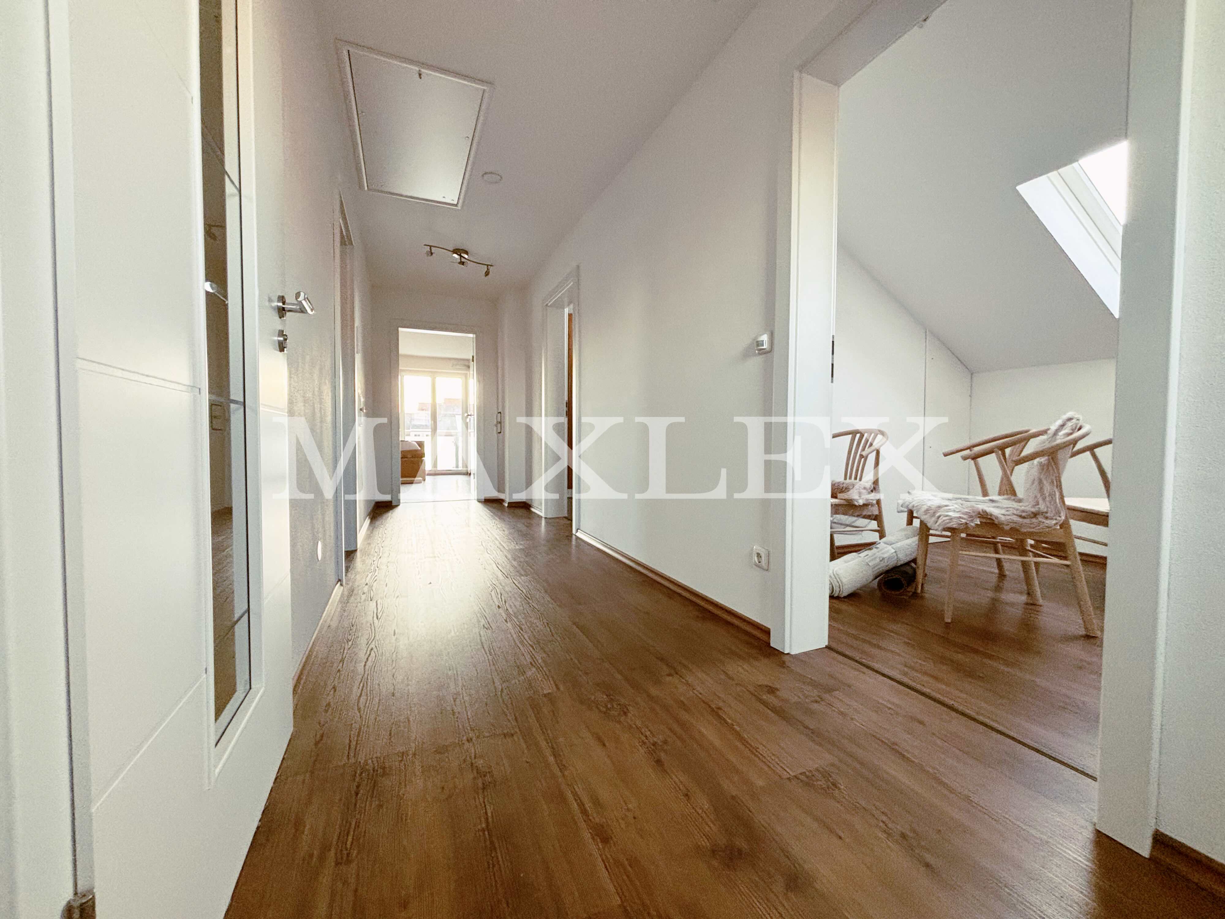 Obergeschosswohnung (ca. 76 m²): 2,5 Zimmer, Balkon (12 m²), Tageslichtbad mit ebenerdiger Dusche, moderne Einbauküche, großer Dachboden mit Zugtreppe als zusätzlicher Stauraum