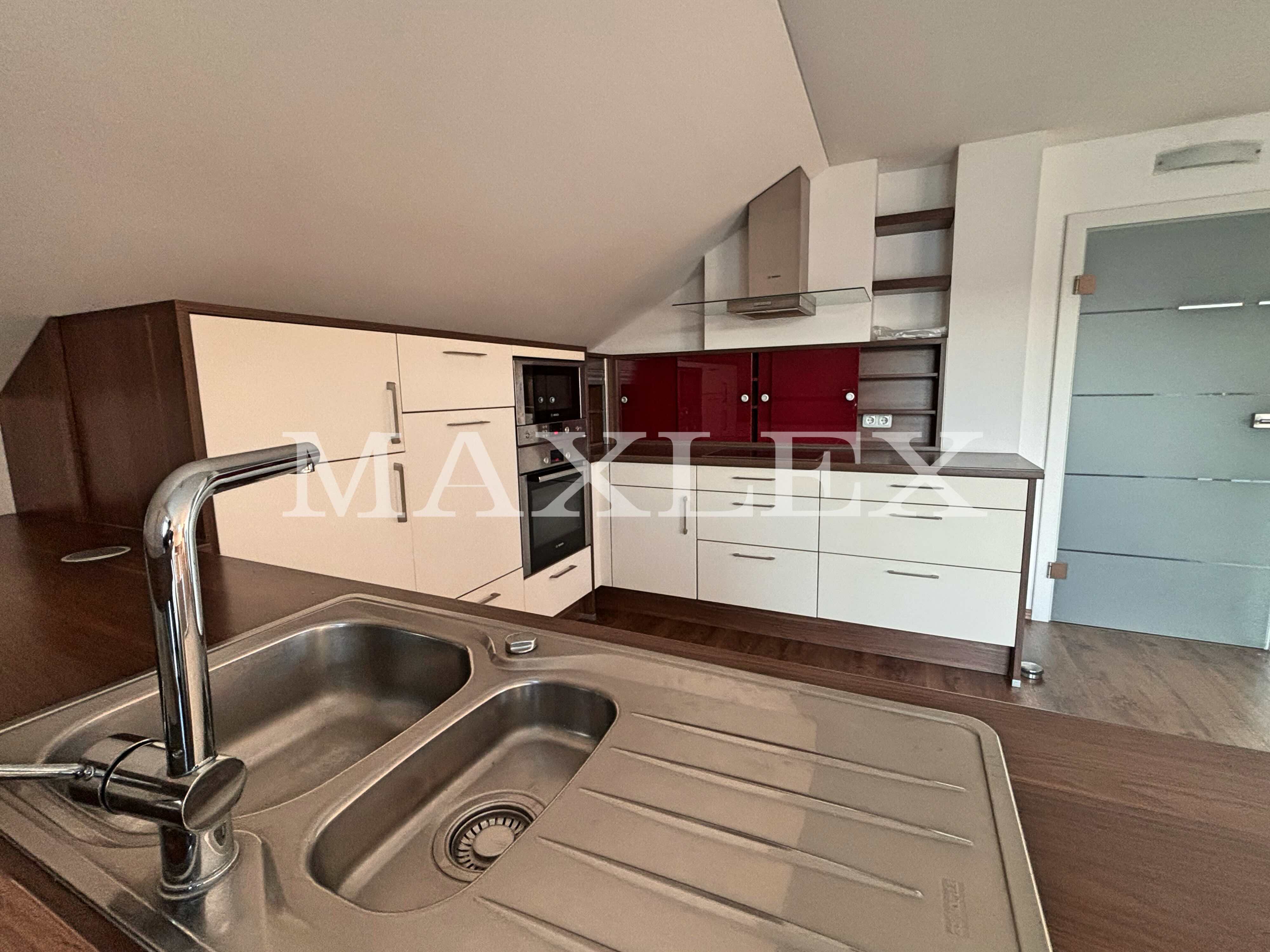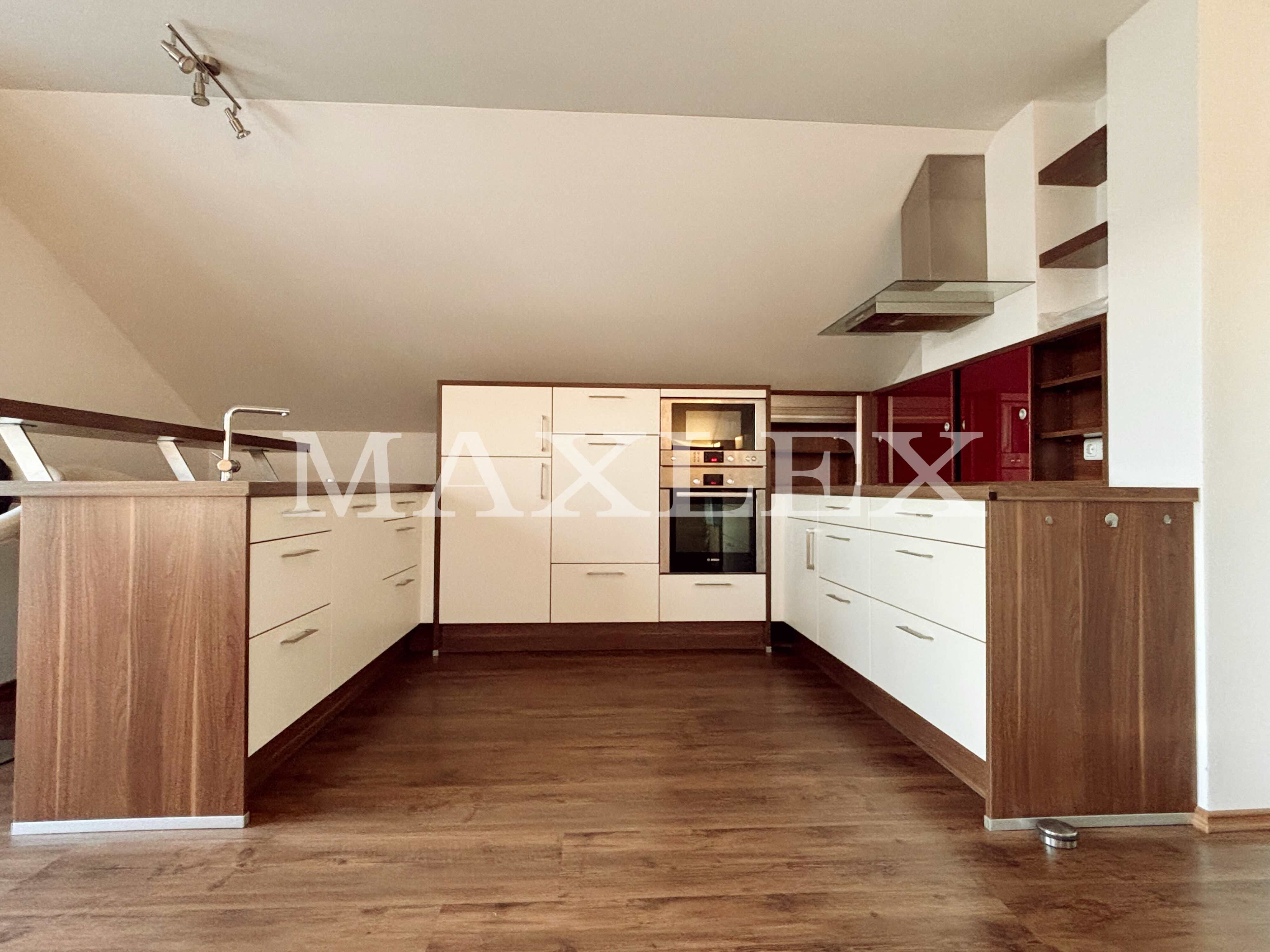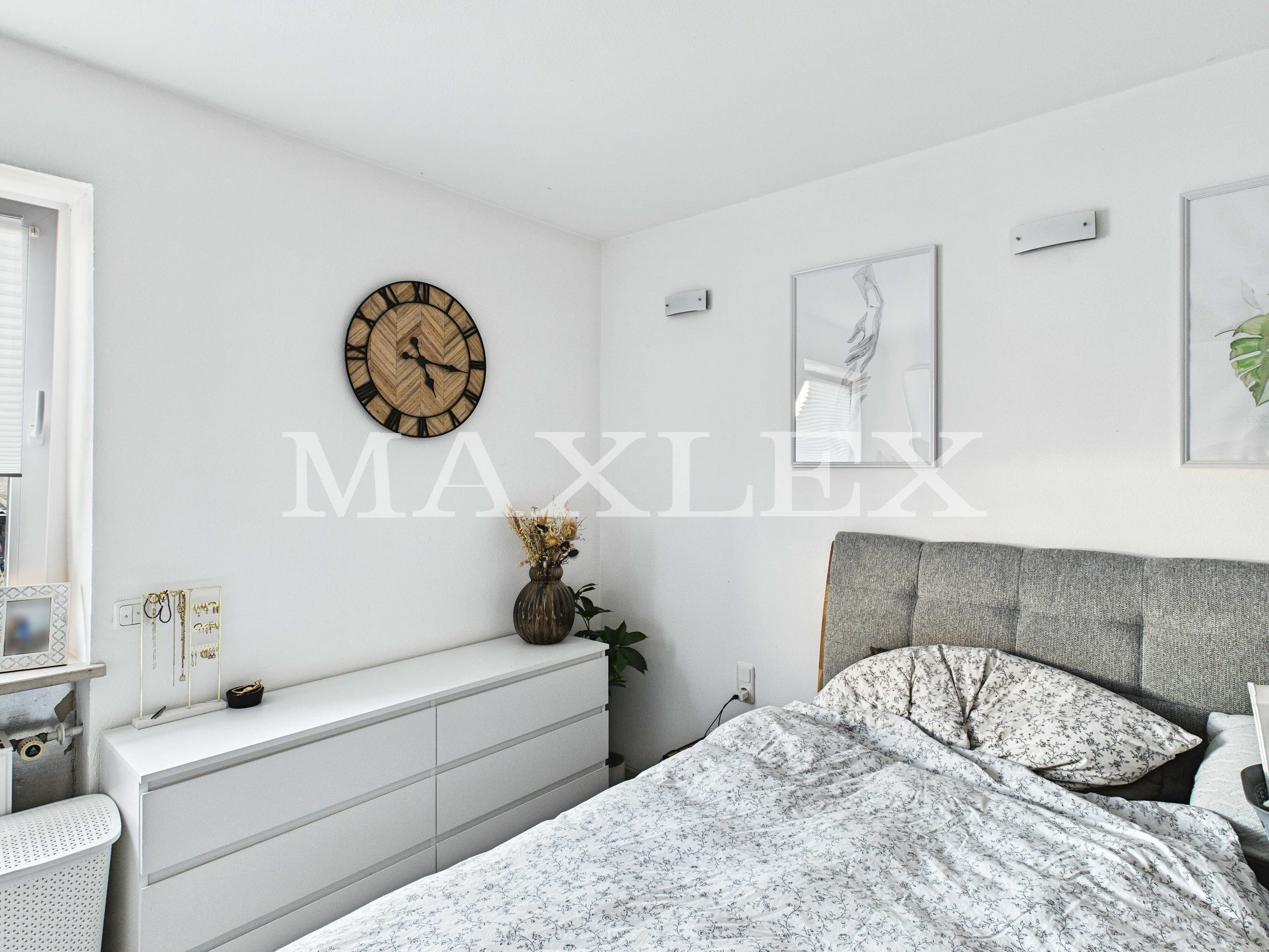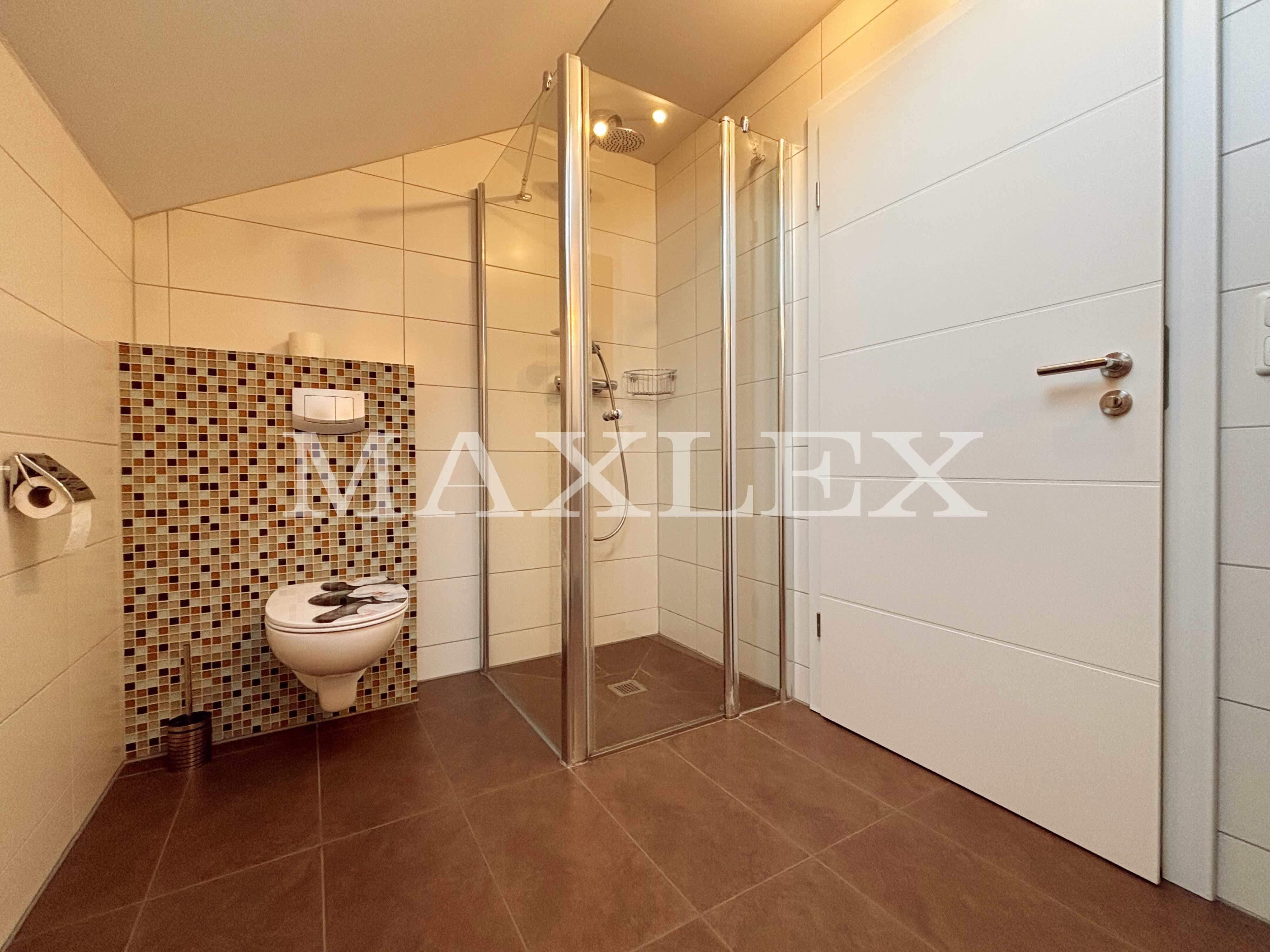Obergeschosswohnung (ca. 76 m²): 2,5 Zimmer, Balkon (12 m²), Tageslichtbad mit ebenerdiger Dusche, moderne Einbauküche, großer Dachboden mit Zugtreppe als zusätzlicher Stauraum
