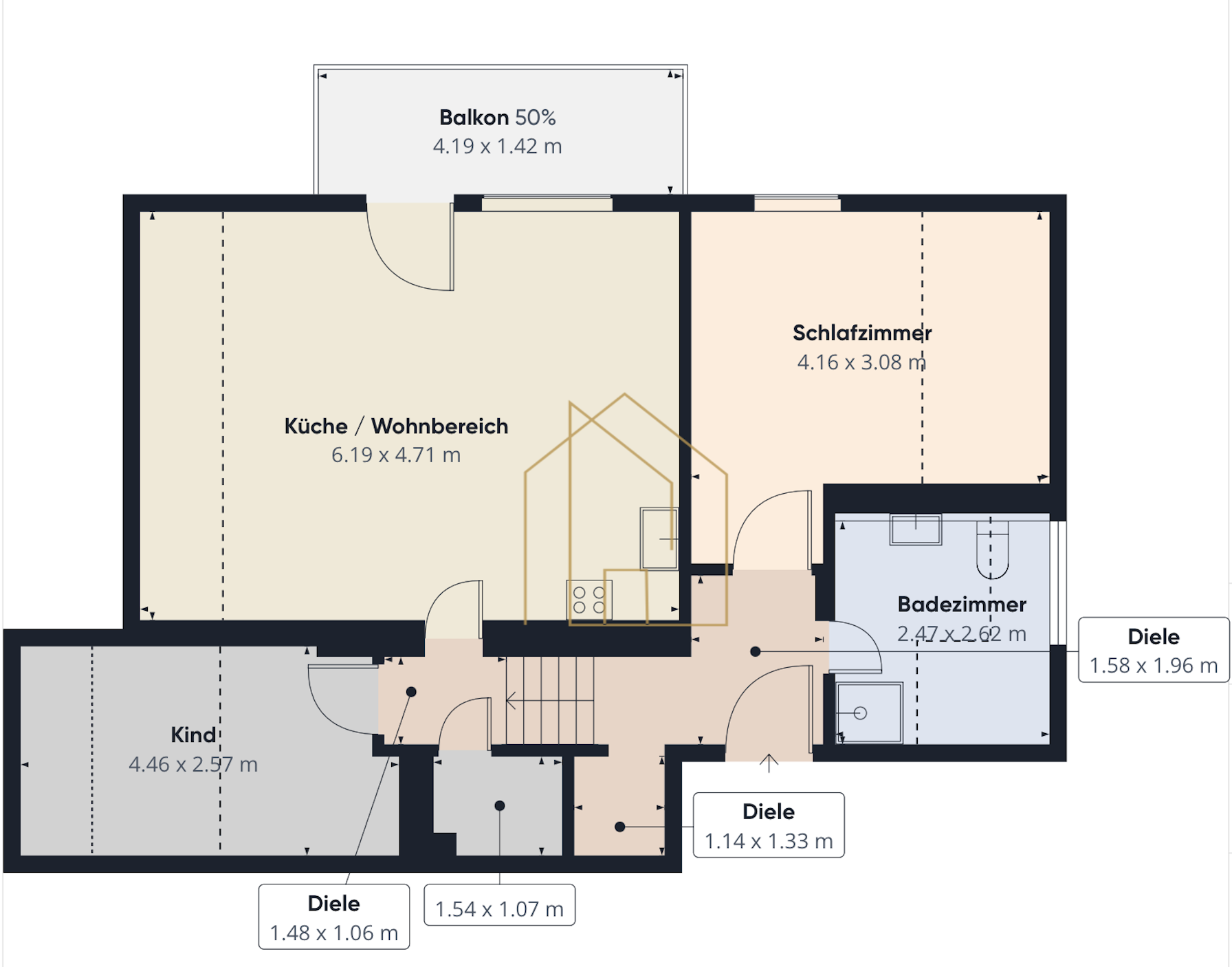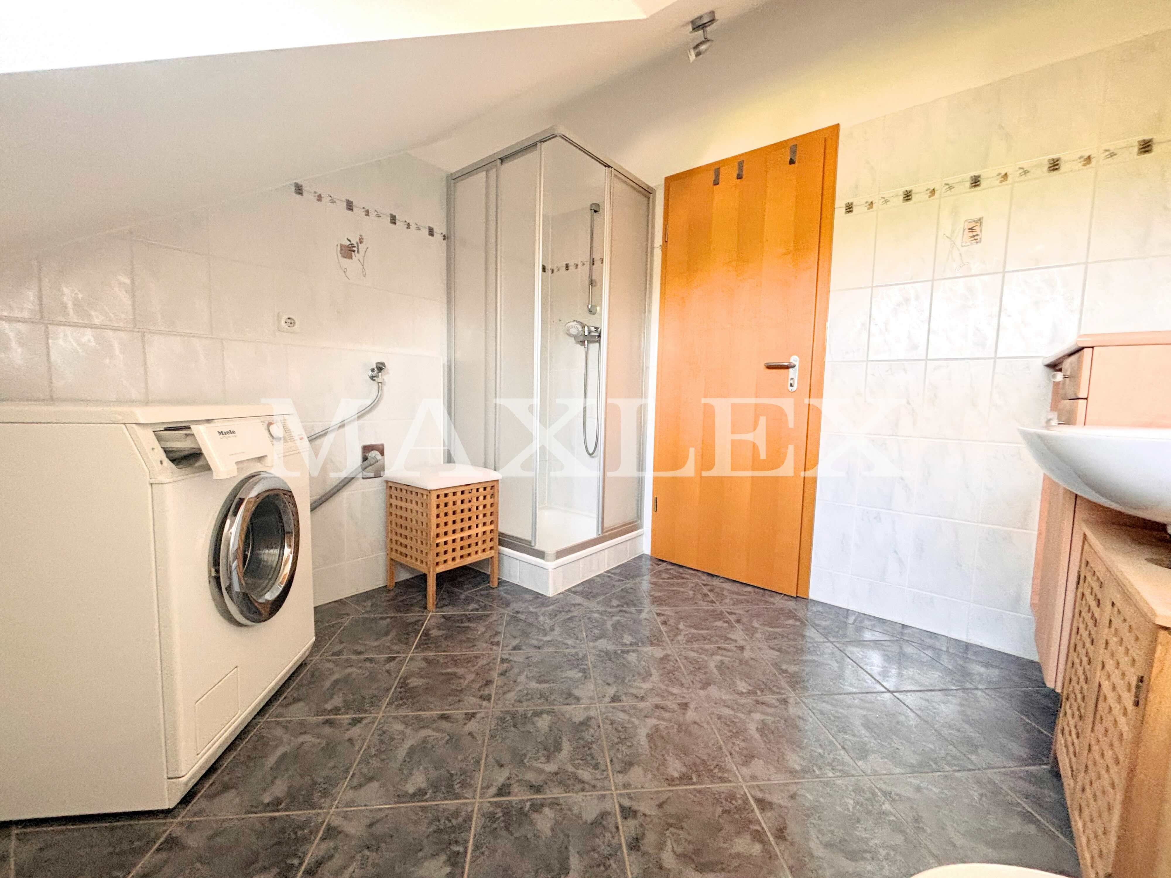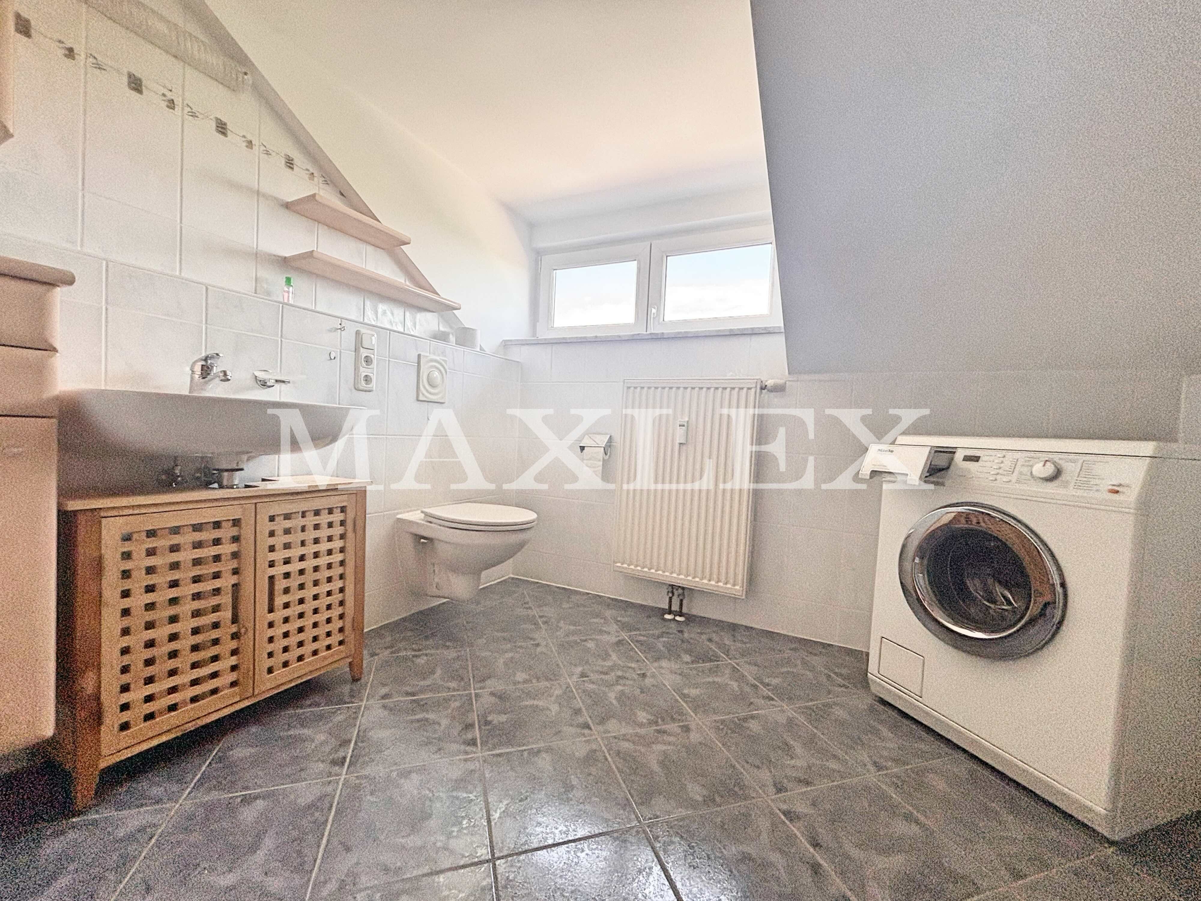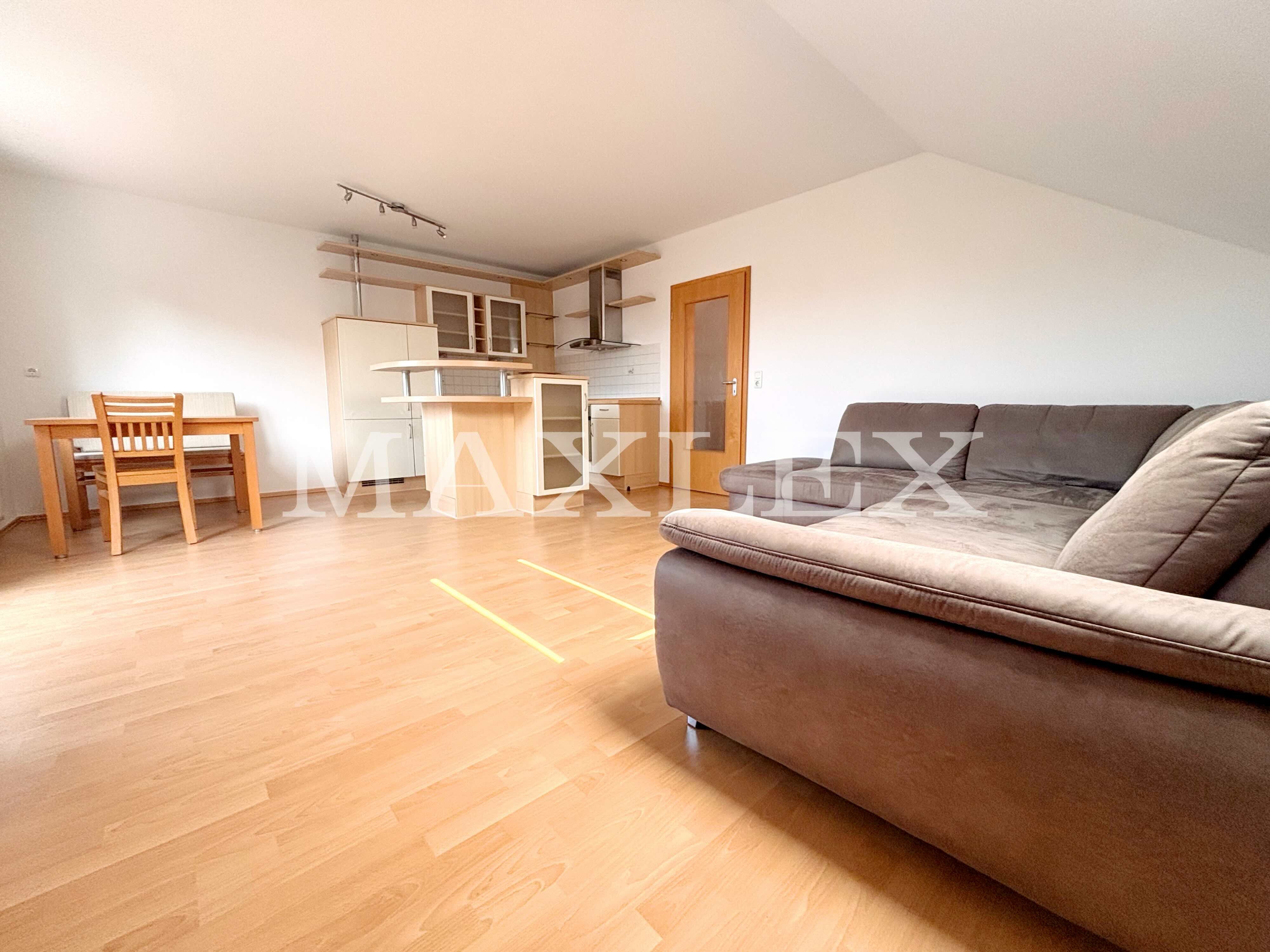 Der Wohnbereich mit Laminatboden wirkt freundlich und offen. Die angrenzende Einbauküche mit Kochinsel ist im Wohn/Ess-Kochbereich praktisch integriert. Das Badezimmer ist gefliest und verfügt über eine zeitlose Ausstattung. Ein zusätzliches Zimmer mit Dachschräge kann flexibel als Arbeits-, Gäste- oder Hobbyraum genutzt werden.