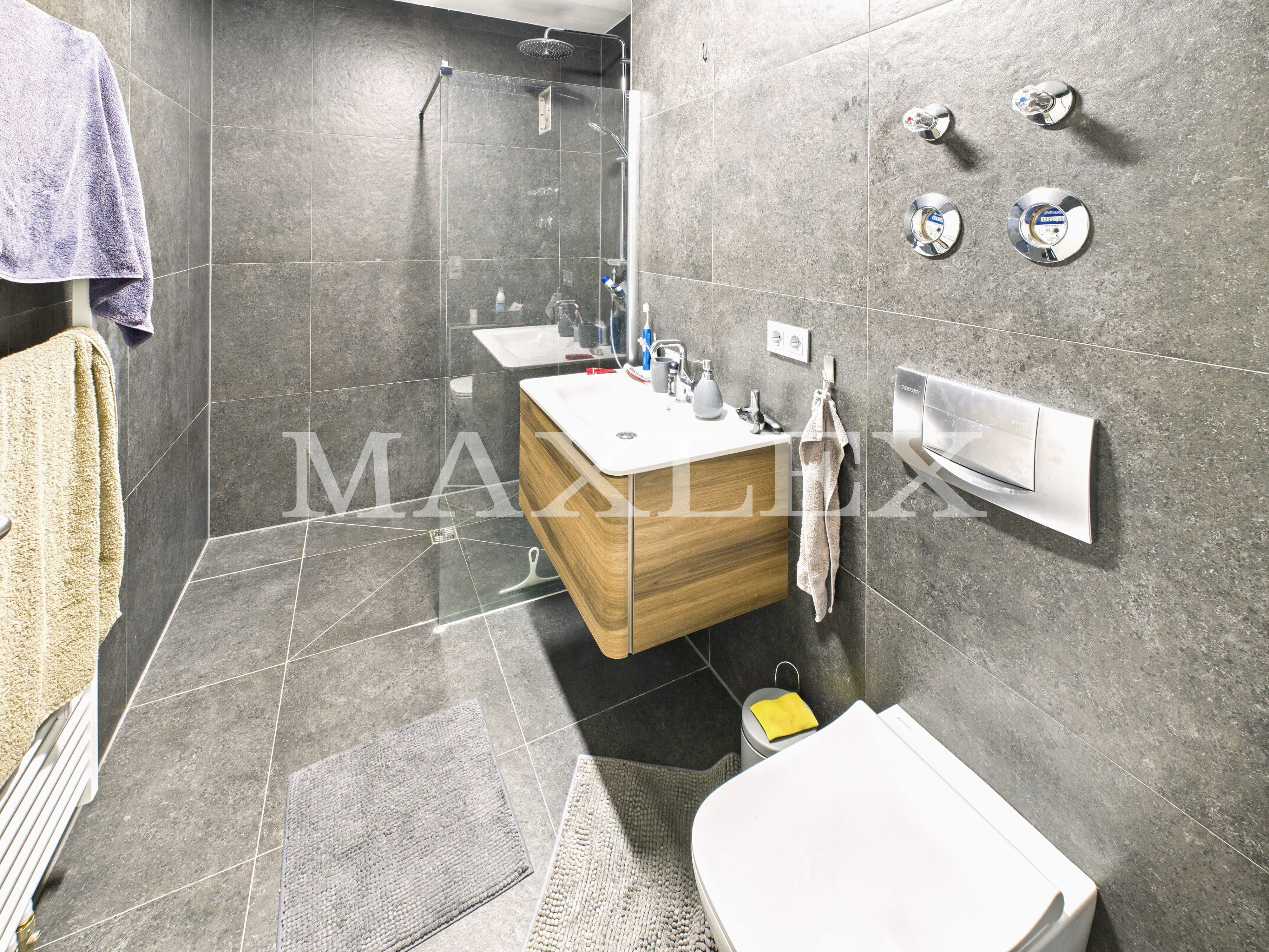 Badezimmer: komplett neu, mit begehbarer Dusche, Regendusche und modernem Waschtisch.