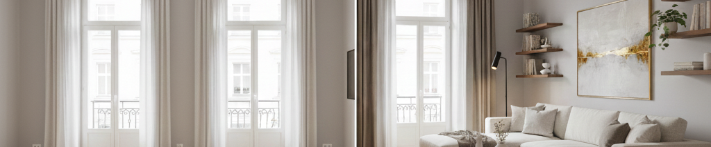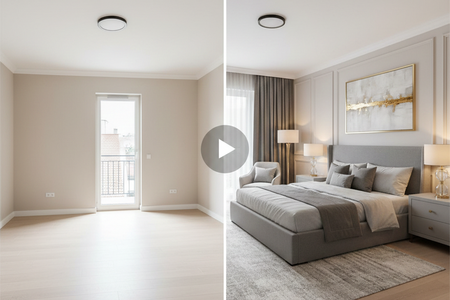 In der Regel genügen uns hochwertige Fotos der leeren Räume. Falls die Immobilie noch bewohnt oder renovierungsbedürftig ist, können wir durch „Digital Decluttering“ auch alte Möbel entfernen und den Raum komplett neu gestalten.
